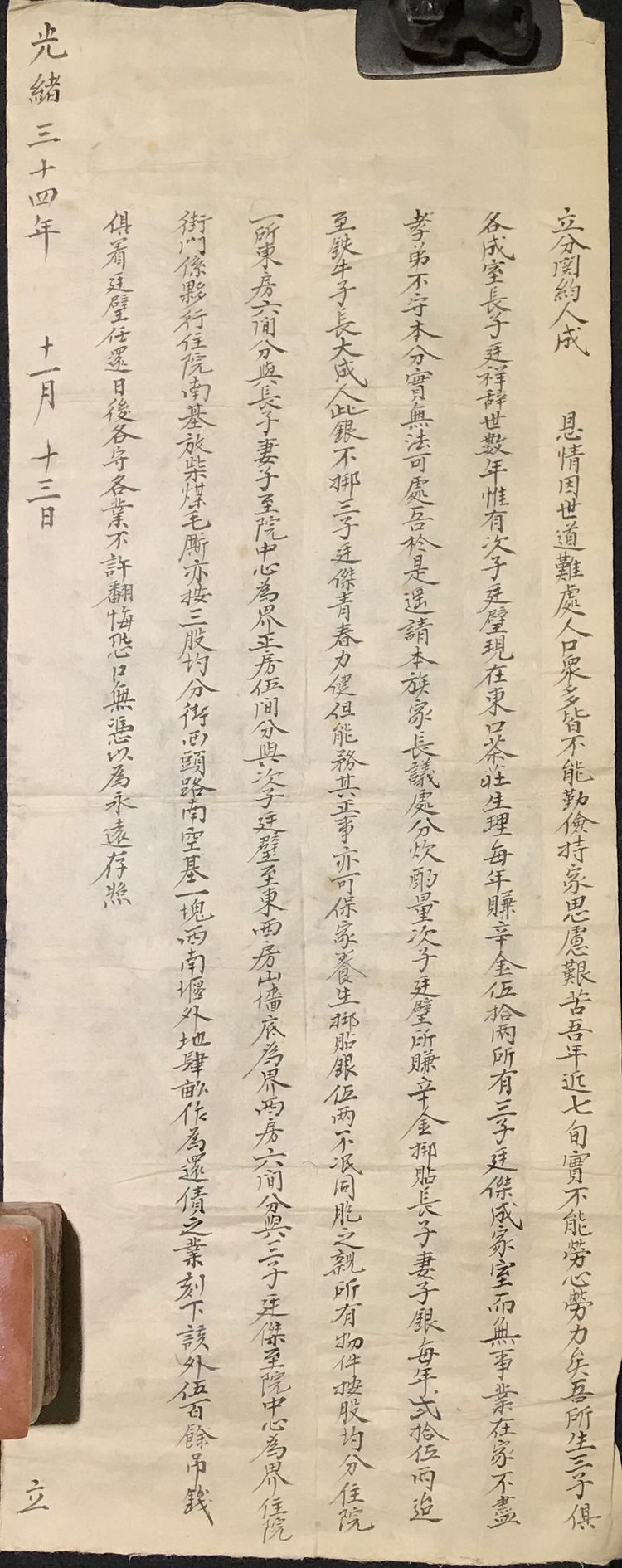 光緒三十四年詒遠堂成廷璧之父成恩分炊契約