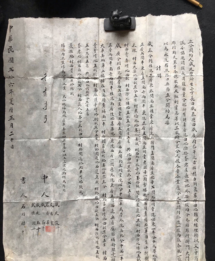 立分關(guān)約人成廷璧,所生二子,長曰成泰,次曰成廣。因己年近古稀精力漸衰,家務(wù)田地難以經(jīng)理,所以父子商議妥協(xié),邀請族長鄰誼,酌量分配所有柴房院田地。除撥養(yǎng)老產(chǎn)、長孫地外,按二股均分。茅廁伙行,街門、大門伙行伙走,至于各號股本及紅利官息等以三股均分。自分之后,各守各業(yè)。應(yīng)分之產(chǎn)開列于后,一樣兩張,各執(zhí)一張,以為永遠存照,恐口無憑,立分關(guān)約為據(jù)。計開: